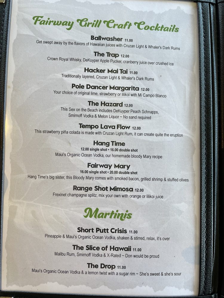 With attentive waiter service and a menu that celebrates American flavors, Fairway Grill invites you to indulge in a memorable culinary adventure. Call (808) 731-4560 to reserve your experience!