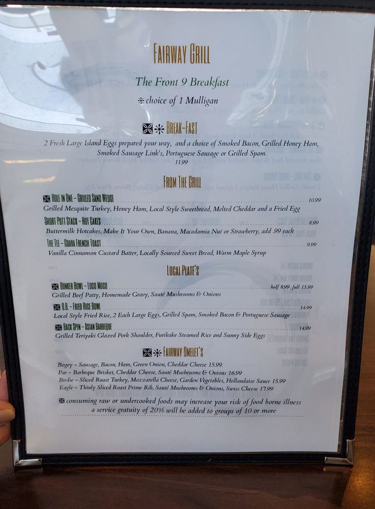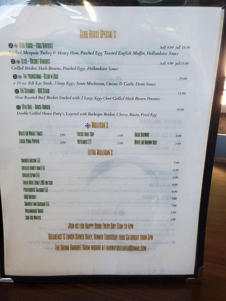 Welcome to Fairway Grill, an inviting hub for food lovers nestled in Hilo, Hawaii. This American eatery specializes in breakfast and brunch, offering a variety of delicious options that cater to every palate. Whether you're in the mood for hearty classics or innovative twists, Fairway Grill has something to delight your taste buds.